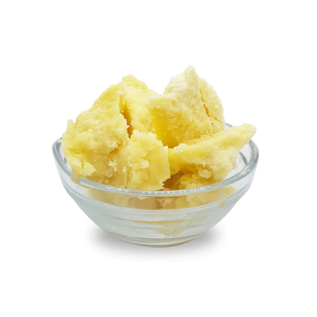 Shea Butter is a fat extracted from the nut of the African shea tree (Vitellaria paradoxa). It is ivory in color when raw and commonly dyed yellow with borututu root or palm oil. It is widely used in cosmetics as a moisturizer, salve or lotion. Shea butter is edible and is used in food preparation in some African countries. Occasionally, shea butter is mixed with other oils as a substitute for cocoa butter, although the taste is noticeably different.